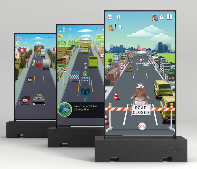The branded game takes place on a large screen at the client's exhibition both. Players tap on 1 of 3 buttons to swing the bat at an incoming ball. They can choose to swing the bat high, in the middle or go low.
