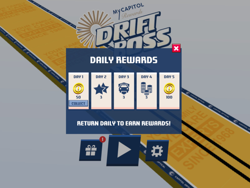 Players control a variety of branded drift cars from eyewear brands such as Acuvue, Freshkon, Hoya, Bausch and Lomb, and Alcon. Top players get to convert their leaderboard points into actual reward programme points, giving them massive value for their next purchase and building brand loyalty.